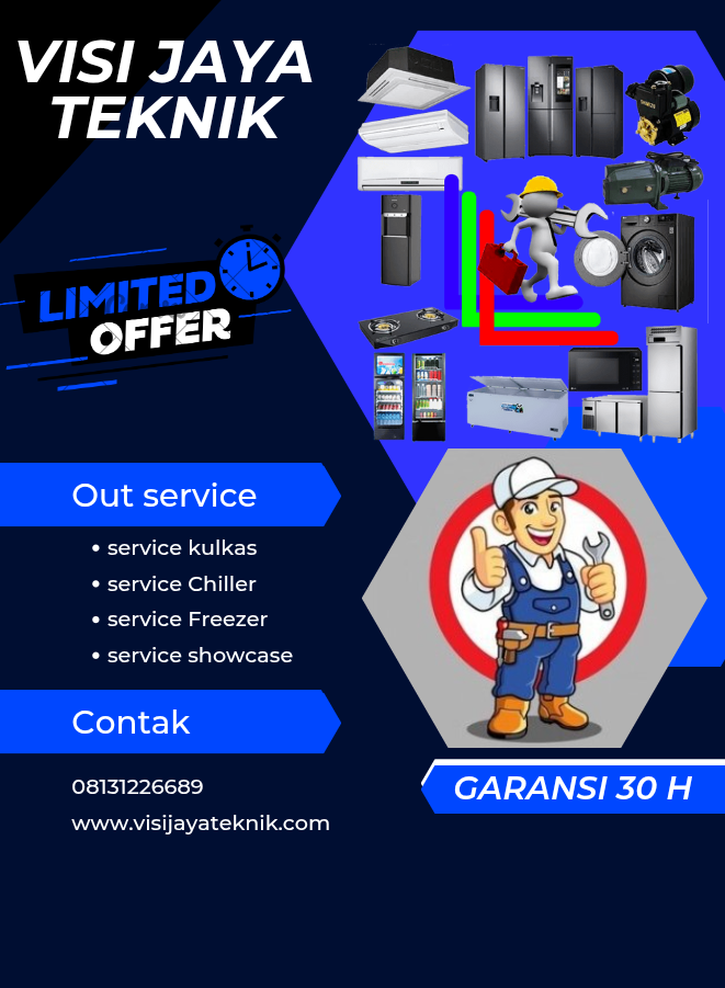 Visi Jaya Teknik adalah penyedia jasa service kulkas, freezer, chiller, dan showcase panggilan di kawasan Jakarta, Tangerang, dan Bekasi.Kami menangani beragam jenis jasa service terkait alat-alat elektronik tersebut seperti kebocoran, kulkas tidak dingin, mengeluarkan bau tidak sedap, isi ulang freon, dan lain sebagainya